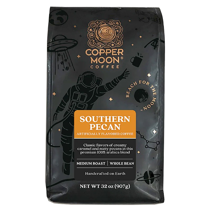 Copper Moon Coffee Southern Pecan зі смаком південного пекану - це класична суміш зі смаковими характеристиками вершкової карамелі та горіхів пекан, що нагадує домашній пиріг.