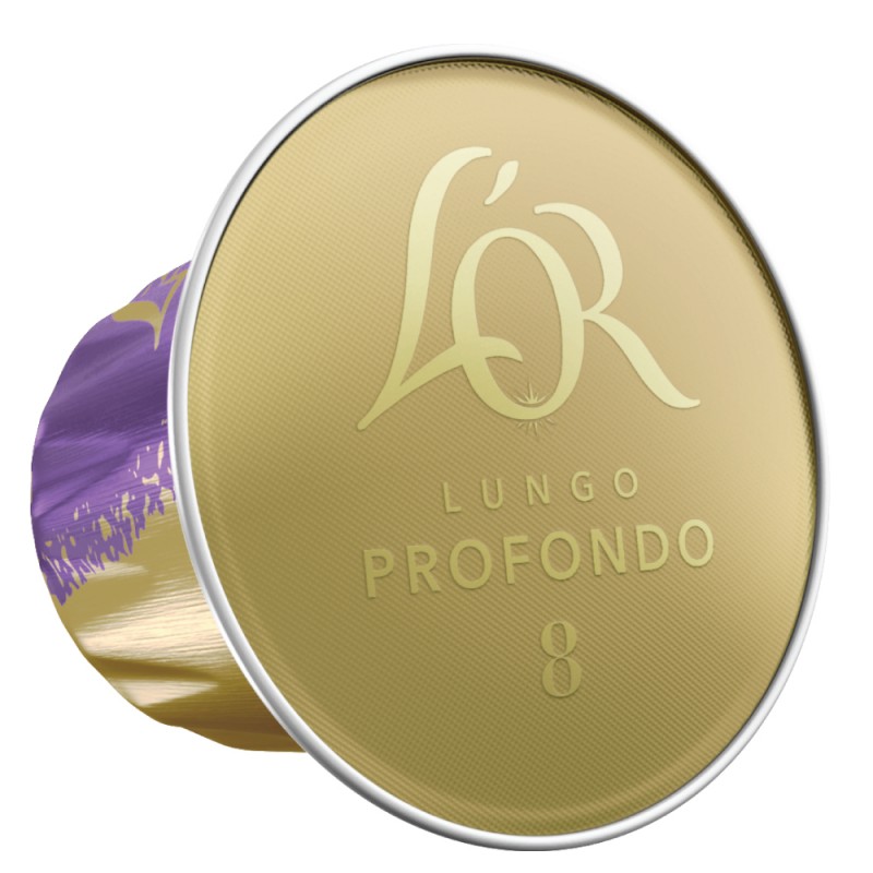 L'or Lungo Profondo розпалить Ваші почуття розкішним ароматом смаженого мигдалю і спокусливої локриці, народженого під мерехтливо-бронзовим шаром ніжної кавової крема.