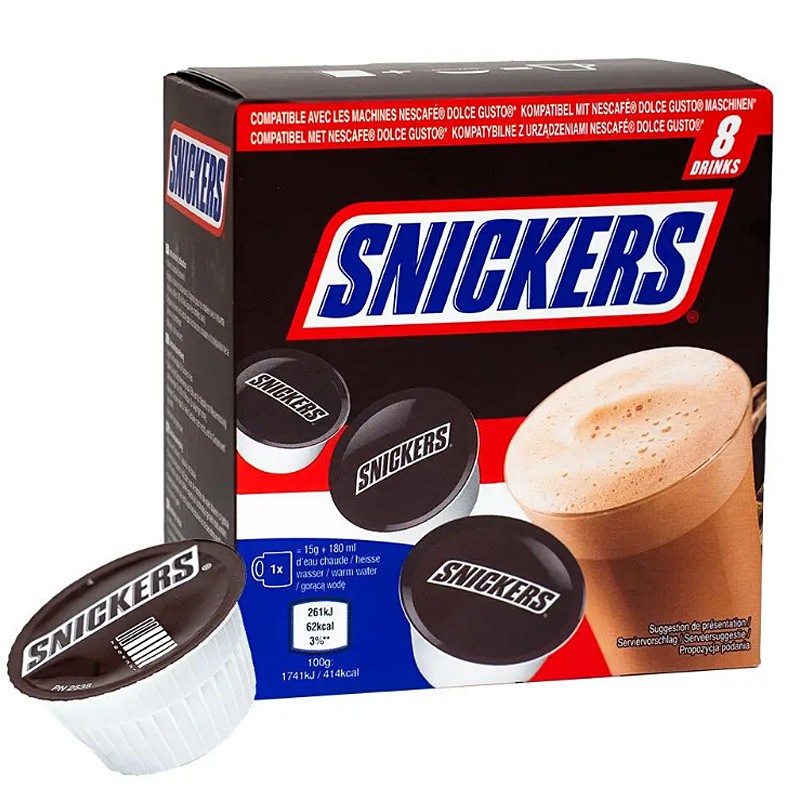 Спробуйте гарячий шоколад Nescafe Dolce Gusto Snickers (8 шт.) - капсульний формат дозволяє приготувати гарячий шоколад дуже швидко. В упаковці 8 капсул "шоколаду" Snickers.